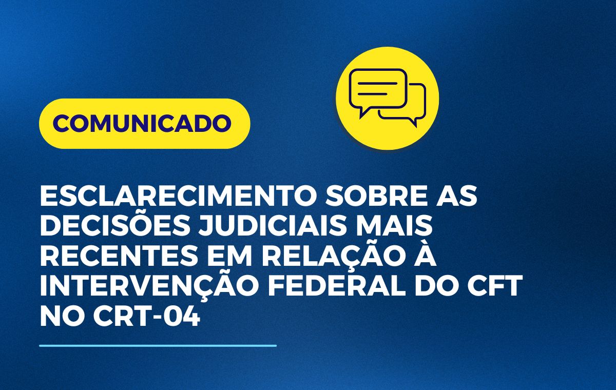 Ressaltando nosso compromisso com a transparência, a informação verídica e a primazia do serviço público, consideramos que é importante esclarecer a recente decisão judicial em relação à intervenção federal do CFT (Conselho Federal dos Técnicos Industriais) no CRT-04 (Conselho Regional dos Técnicos Industriais da 4ª Região).