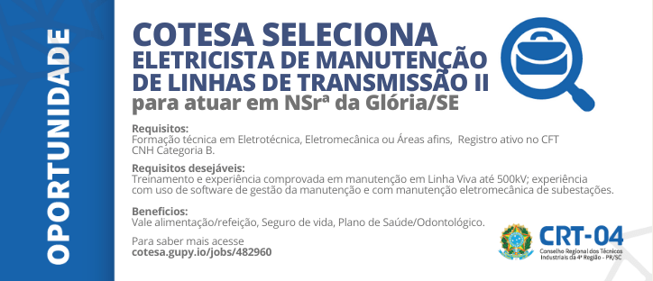 OPORTUNIDADE COTESA PARA  ELETRICISTA DE MANUTENÇÃO DE LINHAS DE TRANSMISSÃO II  em NSrª da Glória/SE