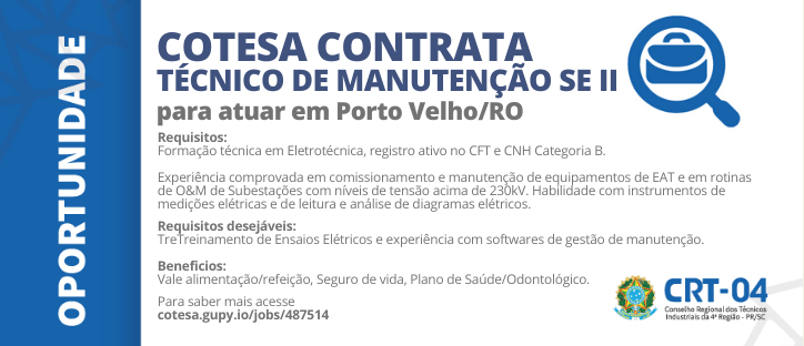 A COTESA selecionando Técnicos de Manutenção SE II , para atuar na UHE Santo Antônio Energia (SAE), na cidade de Porto Velho, em Rondônia. O profissional desejado deverá ter formação técnica em eletrotécnica, com registro ativo no CFT e CNH Categoria B. A empresa exige experiência comprovada em comissionamento e manutenção de equipamentos de EAT e em rotinas de O&M…