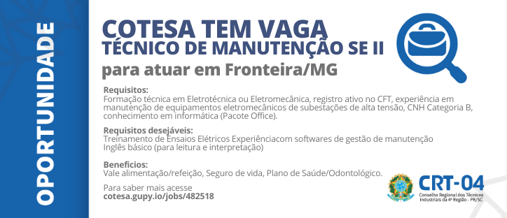 OPORTUNIDADE COTESA - Técnico de Manutenção SE II para atuar em Fronteira/MG