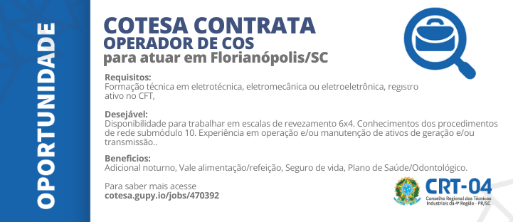 COTESA OFERECE VAGA PARA TÉCNICO EM ELETROTÉCNICA, ELETROMECÂNICA OU ELETROELETÔNICA para atuar como OPERADOR DE COS em Florianópolis/SC.
