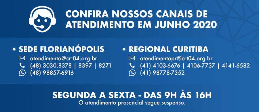 Diante do cenário desafiador e único que estamos enfrentando em virtude da atual pandemia de Covid-19, o CRT-04 segue acompanhando a situação e reforça seu compromisso no combate à disseminação do novo Coronavírus no país. Em respeito e cuidado com os nossos colaboradores e com todos os profissionais técnicos, suspendemos provisoriamente todos os contatos presenciais em nossos escritórios. Contudo, continuamos…