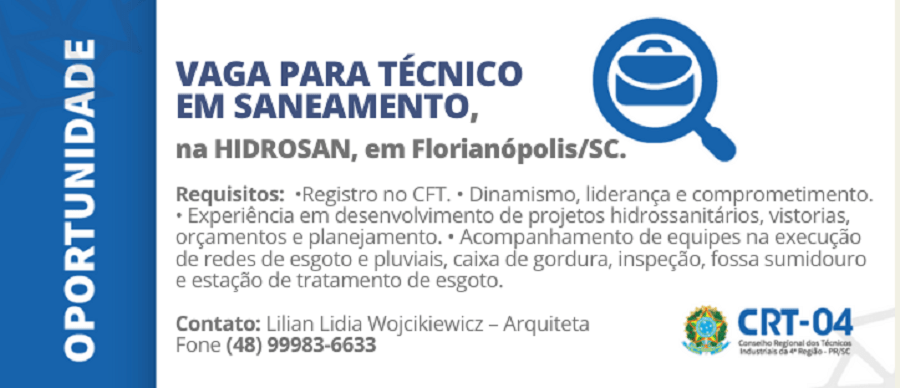 A HIDROSAN Engenharia & Consultoria está selecionando profissional com formação técnica em Saneamento e registro ativo no CFT, para atuar em Florianópolis/SC. O profissional desejado deverá ter perfil dinâmico, comprometimento e liderança, além de experiência em desenvolvimento de projetos hidrossanitários, vistorias, orçamentos e planejamento, acompanhamento das equipes na execução de redes de esgoto e pluviais, caixa de gordura, inspeção, fossa…