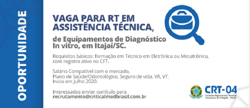 A Criticalmed está selecionando profissional para assumir a Assistência Técnica de Equipamentos de Diagnóstico In vitro, na cidade de Itajaí/SC. Os requisitos básicos para o cargo são:  formação em Técnico em Eletrônica ou Mecatrônica com registro ativo no CFT – Conselho Federal dos Técnicos Industriais, além de disponibilidade para iniciar as atividades em julho 2020. A empresa oferece salário compatível…